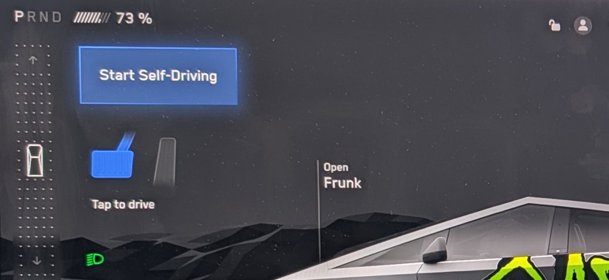 FSD v14.1.5가 설치된 사이버트럭에 탑승하면 여러 가지를 경험하게 됩니다. 먼저, 사이버트럭의 독특한 스타일 UI에 드디어 나타난 전설적인 파란색 "자율주행 시작" 버튼부터 시작해야 합니다. 버튼을 누르면 FSD가 자동으로 전진 또는 후진 모드로 전환되어 주행을 시작합니다. 사이버트럭에는 이미 FSD v13.2.9가 설치되어 있었지만, 다른 HW4 차량에서 제공하는 많은 기능이 부족했고, 주차 상태에서 FSD 시작 기능은 그중 하나였습니다.