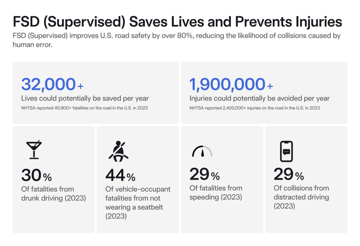 테슬라는 새로운 안전 페이지에서 NHTSA 데이터에 따르면 현재 미국 교통사고 사망자의 90%가 음주 운전, 과속, 부주의 등 인적 요인으로 인해 발생한다고 언급했습니다. 테슬라는 운전의 복잡성에서 인적 요인을 제거함으로써 FSD가 미국에서만 3만 2천 명 이상의 생명과 190만 건의 부상을 예방할 수 있다고 주장합니다.