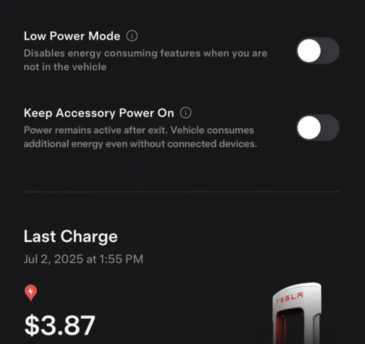 2025.38 차량 업데이트는 최신 Tesla 앱 의 '액세서리 전원 켜짐 유지' 옵션에 대한 지원을 추가합니다. 이 옵션은 최신 Tesla 앱 업데이트의 일부로, 대부분의 충전 옵션을 단일 메뉴로 통합하는 새로운 충전 메뉴가 추가되었습니다.