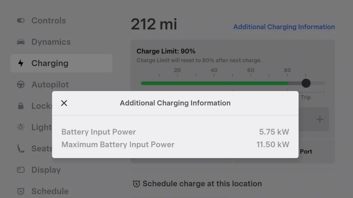 차량이 충전 중일 때 Tesla는 이제 컨트롤 > 충전 섹션에 '추가 충전 정보' 링크를 제공합니다. 차량이 충전 중이면 링크가 오른쪽 상단에 파란색으로 표시됩니다.