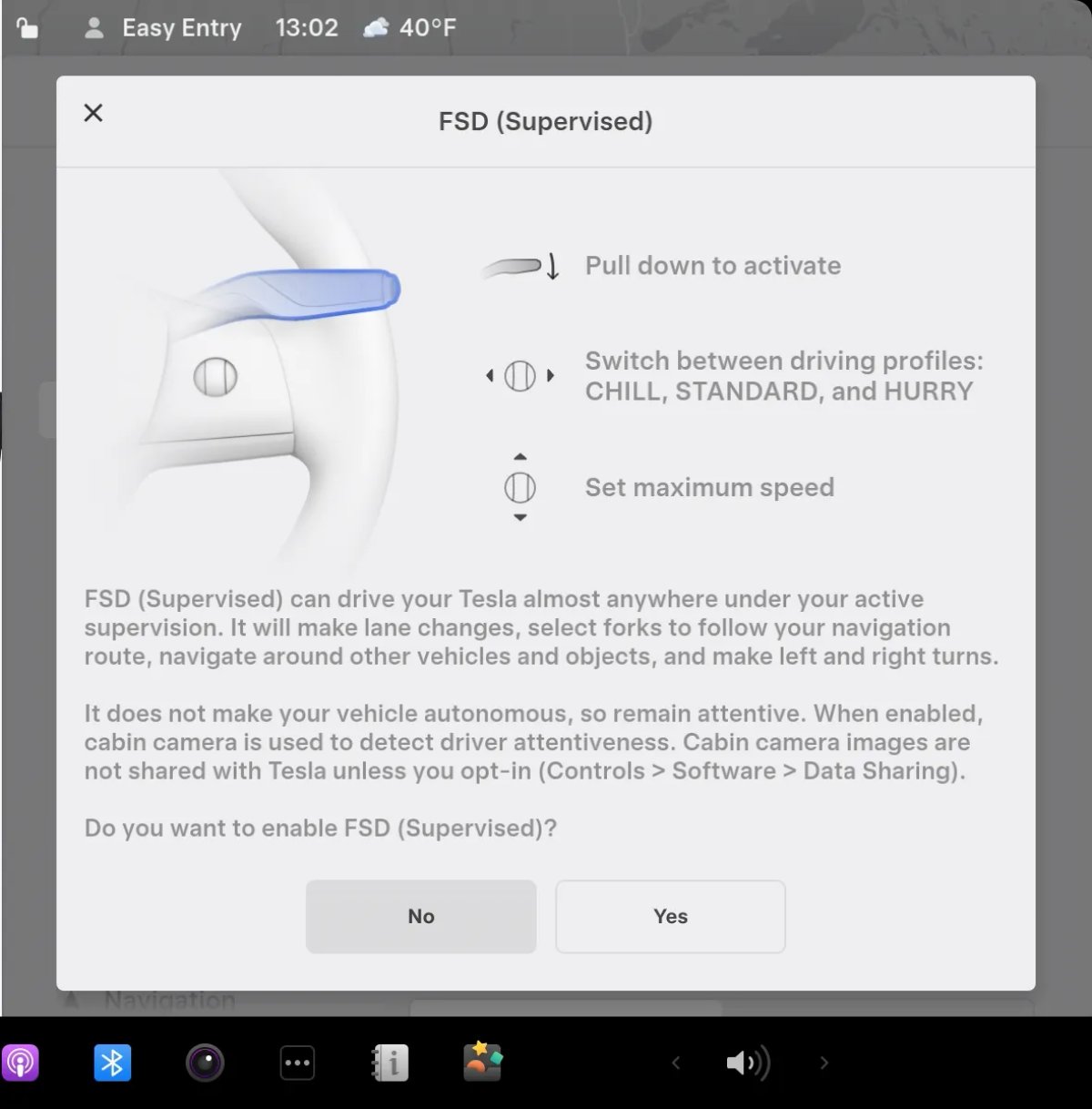 사용자가 컨트롤 > 자동 조종 메뉴에서 FSD를 활성화하면 Tesla는 이제 사용자에게 FSD를 소개하는 단일 화면 가이드를 제공합니다.