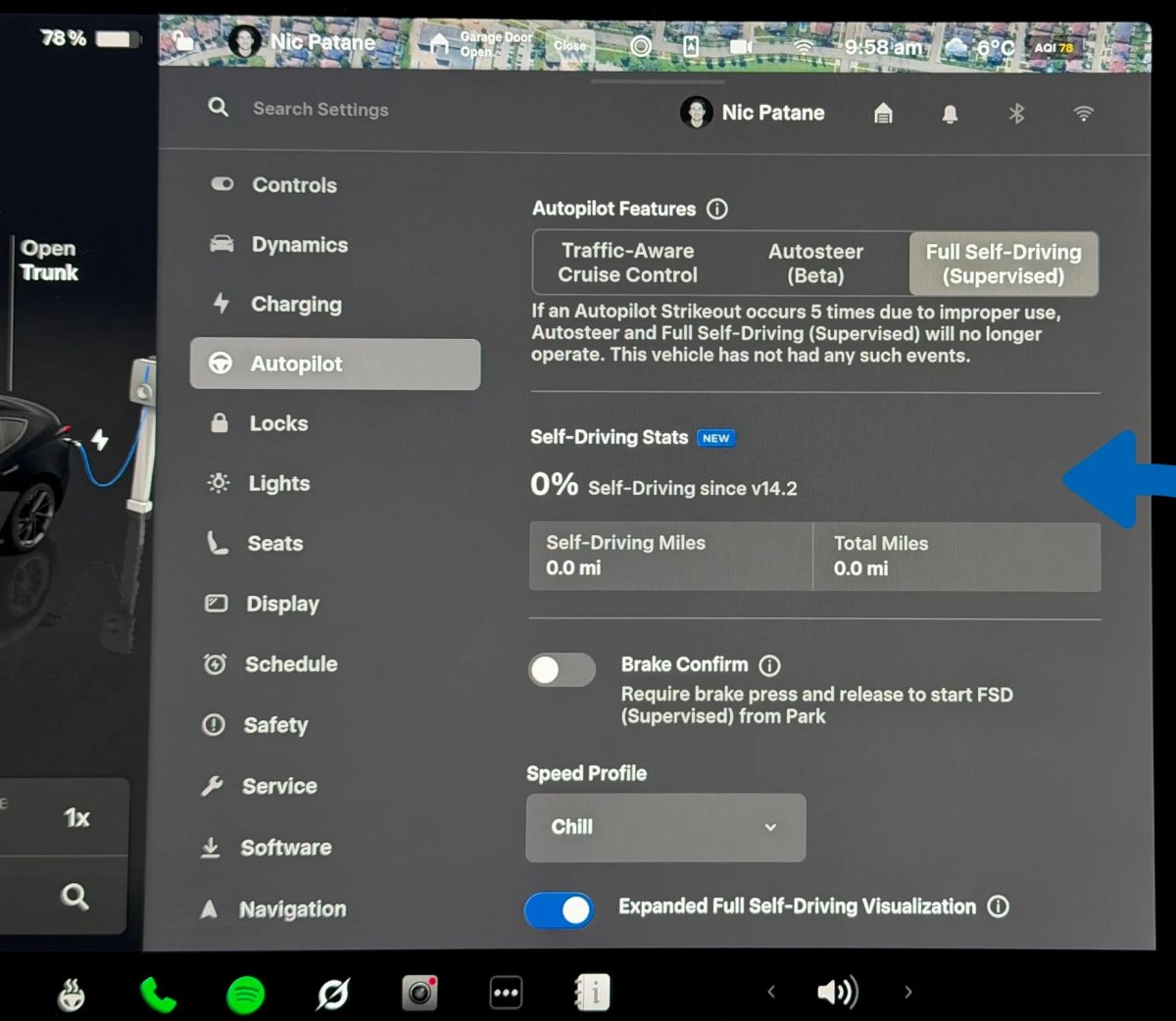 FSD v14.2에는 많은 사용자가 기대했던 놀라운 기능이 있는데, 출시 노트에는 언급되지 않았습니다. 바로 Autopilot 메뉴에 'Self-Driving Stats' 라는 새로운 기능이 추가되었습니다. 이 새로운 섹션에서는 차량의 총 주행 거리와 FSD를 활성화했을 때의 주행 거리를 추적합니다.