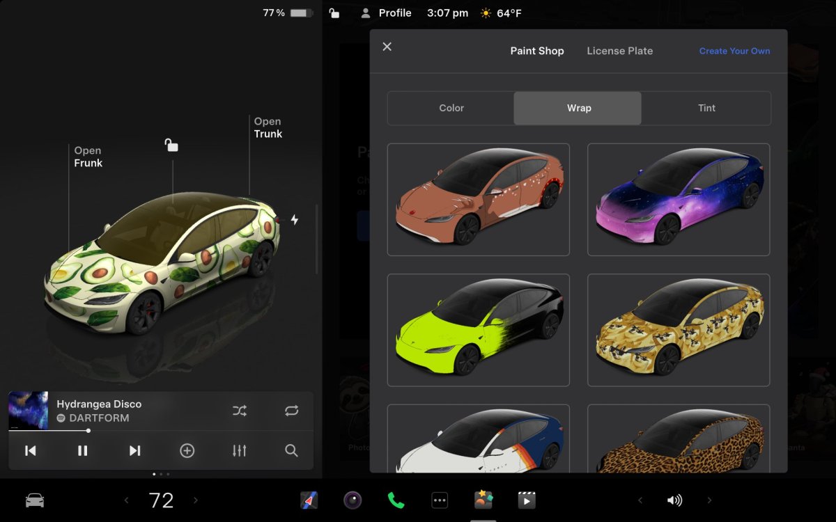 모든 차량 모델에 맞춤형 랩핑과 번호판이 드디어 출시되었습니다. 2024년 홀리데이 업데이트에서 사이버트럭에 처음 적용된 이 기능은 이제 글러브 박스 플래시 드라이브를 사용하여 사전 장착 또는 맞춤형 랩핑과 번호판을 통해 차량을 개인화할 수 있습니다.