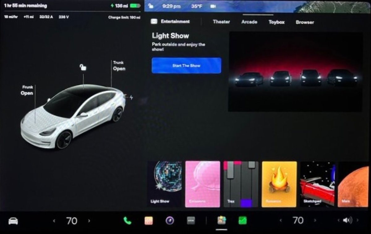엔터테인먼트 기능이 전년과 같은 수준은 아니었지만, 테슬라는 향상된 시각화, 예정된 출발 업그레이드, 붐박스, 배기가스 검사 모드 및 문자 메시지 개선 등 여러 가지 UI 개선을 이루었습니다.